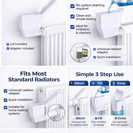 Central Heating Dosing Tool, Radiator Funnel Add Chemicals, Inhibitor Adaptor UK Simplify your central heating maintenance with this essential dosing tool. Designed as a radiator funnel adaptor, it allows you...